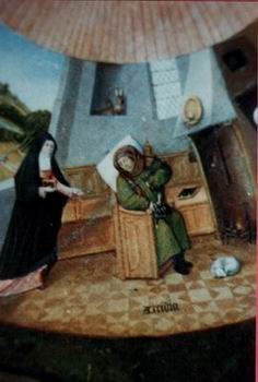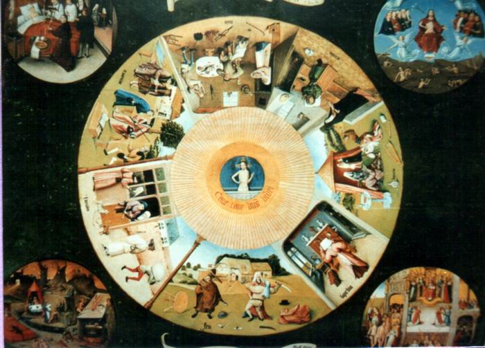 ![]() HIERONIMUS BOSCH (1459/60 – 1516) slika SEDEM NAGLAVNIH GREHOV, Prado, MadridSlika je bila naslikana na leseno ploščo med leti 1495/1510, verjetno kot namizna plošča, ki pa jo je kasneje Filip II. obesil v svoji spalnici v Escorialu. V sredini je Kristusov lik, kot božje oko, okoli njega 128 žarkov in nanizanih sedem trapezoidnih slik, ki tvorijo krog in predstavljajo sedem grehov: požrešnost, lenoba, nečistost, napuh, jeza, lakomnost, nevoščljivost. V štirih manjših krogih, ki so na vogalih slike, pa so upodobljene štiri poslednje reči: smrt (levo zg.), sodba (desno sp.), nebesa (desno zg.), pekel (levo sp.)